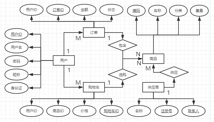 | 订单表 (Order) | 订单ID、用户ID、下单时间、支付类型、订单状态、订单价格、姓名、电话、地址 (order_id、user_id、order_time、payment_type、order_status、order_price、user_name、phone、address) |